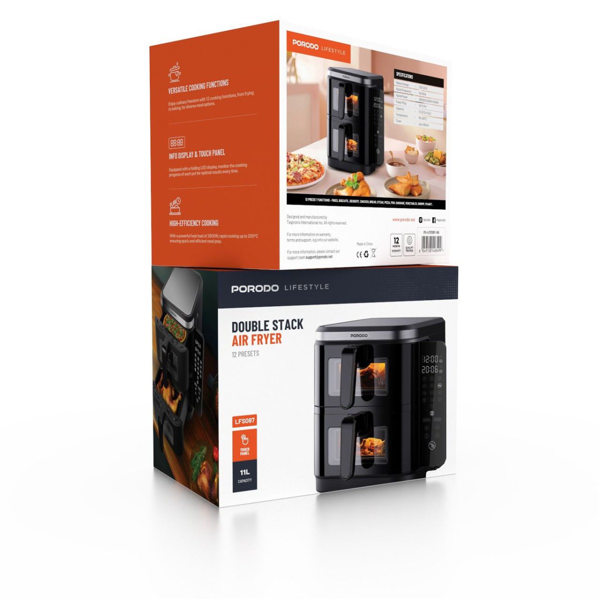 برند: پرودو | PORODO.مدل: LFST087 Double Stack.نمایشگر: پنل لمسی هوشمندتایمر: قابل تنظیم تا 60 دقیقهولتاژ نامی: 220-240 ولتفرکانس نامی: 50-60 هرتزدوشاخه برق: 3 پین انگلستاندما: 60-200 درجه سانتی گراد و دارای پنل تاشو